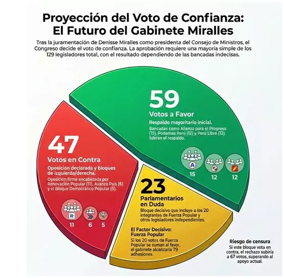 Con todo, y de acuerdo con un reporte de El Comercio, en un análisis preliminar sugiere que el Gabinete Miralles tendría unos 59 votos de respaldo inicial de los 129 legisladores. Quienes apoyan al actual gabinete ministerial serían las bancadas que bajo el argumento de que “priorizan la gobernabilidad frente al corto tiempo que resta para el cambio de mando presidencial”, son las que han resultado beneficiadas con ministros que están bajo su influencia.