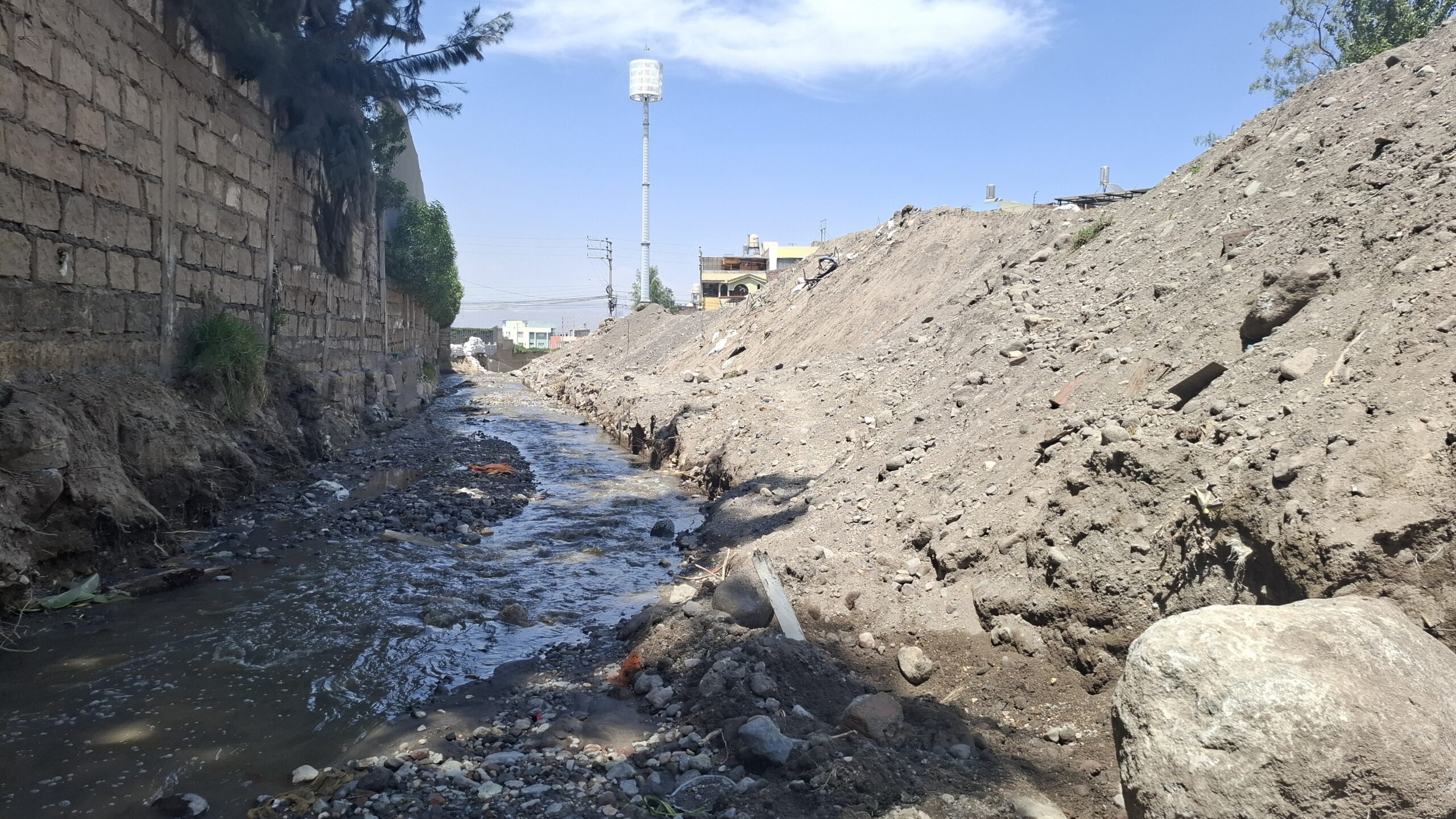 El cauce de la torrentera sufre un estrangulamiento crítico debido a construcciones que han tomado posesión del caudal natural, lo que asegura nuevos desbordes si no se recupera el área ribereña. Actualmente, los trabajos de limpieza en el distrito registran un 85% de avance, pero aún hay grandes montículos de escombros rodeando la torrentera.