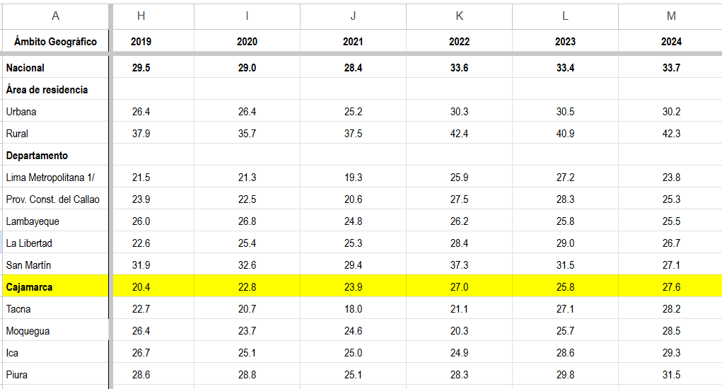 Según el Instituto Nacional de Estadística e Informática (INEI), a través de la Encuesta Demográfica y de Salud Familiar (Endes) 2025, la anemia en niños de 6 a 59 meses en Cajamarca se sitúa alrededor del 27.6%. Si bien esta cifra se ubica por debajo del promedio nacional —en el ranking, Cajamarca se ubica en el puesto 21 de 25 regiones, ubicándose las que menos anemia tienen en las posiciones de más abajo—, no es la región con menos anemia en el Perú. De hecho, la anemia viene en aumento en esa región.