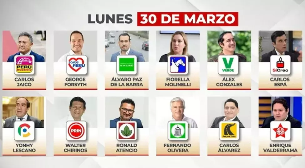 Estarán esta noche de lunes Carlos Jaico (Perú Moderno), George Forsyth (Somos Perú), Álvaro Paz de la Barra (Fe en el Perú), Fiorella Molinelli (Fuerza y Libertad) y, Alex Gonzalez (Demócrata Verde).