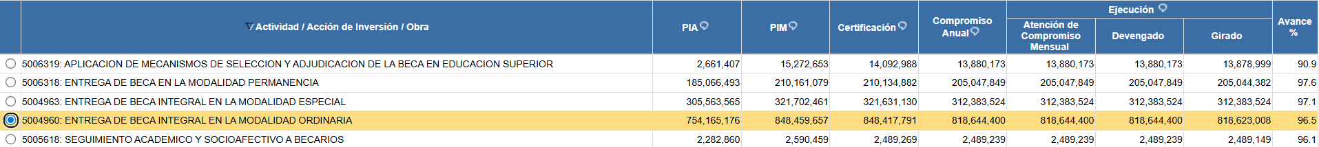 Esta información se puede contrastar a través de Consulta Amigable del Ministerio de Economía y Finanzas, que muestra que el 2024 y año pasado el Pronabec ejecutó más del 90% de su presupuesto en todas sus becas, como se consigna en el siguiente cuadro: