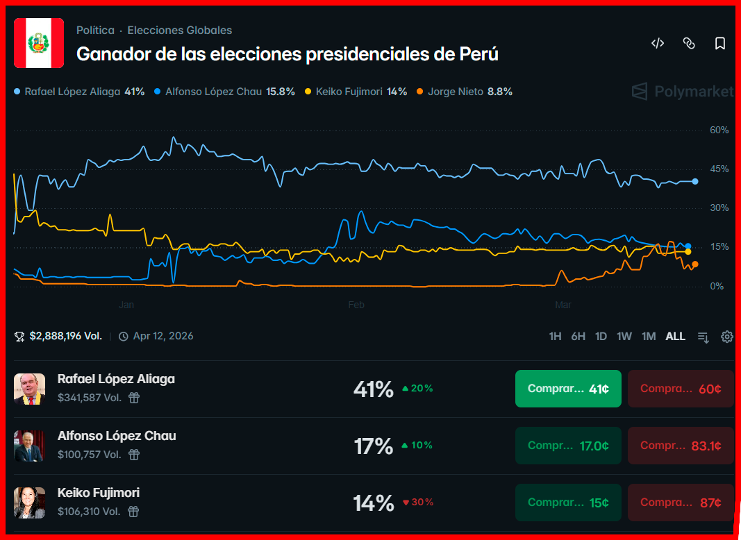 Una imagen que lleva como título ‘Encuesta Polymarket – Probabilidades de elección presidencial Perú 2026’ se ha hecho viral en redes sociales. Según esta, el candidato presidencial de Renovación Popular, Rafael López Aliaga, llegó al 14 de marzo con 51% de posibilidad de ganar las Elecciones. Le siguen Alfonso López Chau (Ahora Nación) con 16% y Keiko Fujimori (Fuerza Popular) con 13%.