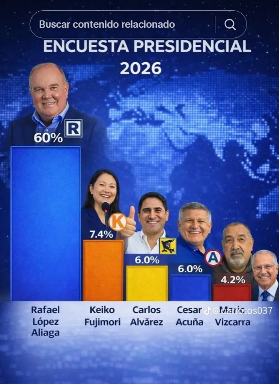 En TikTok circula un video publicado el 9 de marzo por la cuenta ‘5G TV’ que muestra una supuesta “Encuesta presidencial 2026”. En la gráfica, Rafael López Aliaga, candidato de Renovación Popular, aparece con 60% de intención de voto, seguido por Keiko Fujimori con 7.4%, Carlos Álvarez con 6% y César Acuña también con 6%, y finalmente Mario Vizcarra con 4.2%.