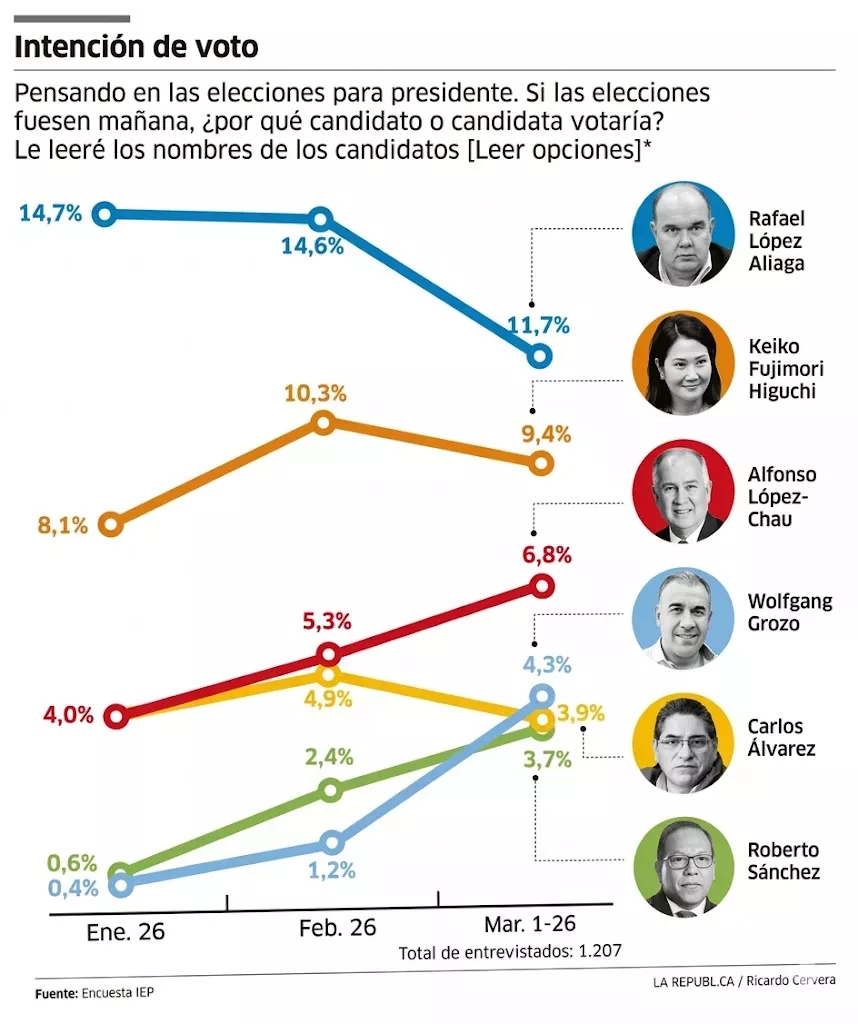 De acuerdo con la última encuesta del Instituto de Estudios Peruanos (IEP) para La República, aunque López-Aliaga y Keiko Fujimori, siguen teniendo en marzo, la mayor intención de voto ciudadano con un 11,7% y 9,4%, respectivamente, la tendencia respecto a sus propios porcentajes de enero y febrero es a la baja para ambos candidatos y también para Carlos Álvarez.