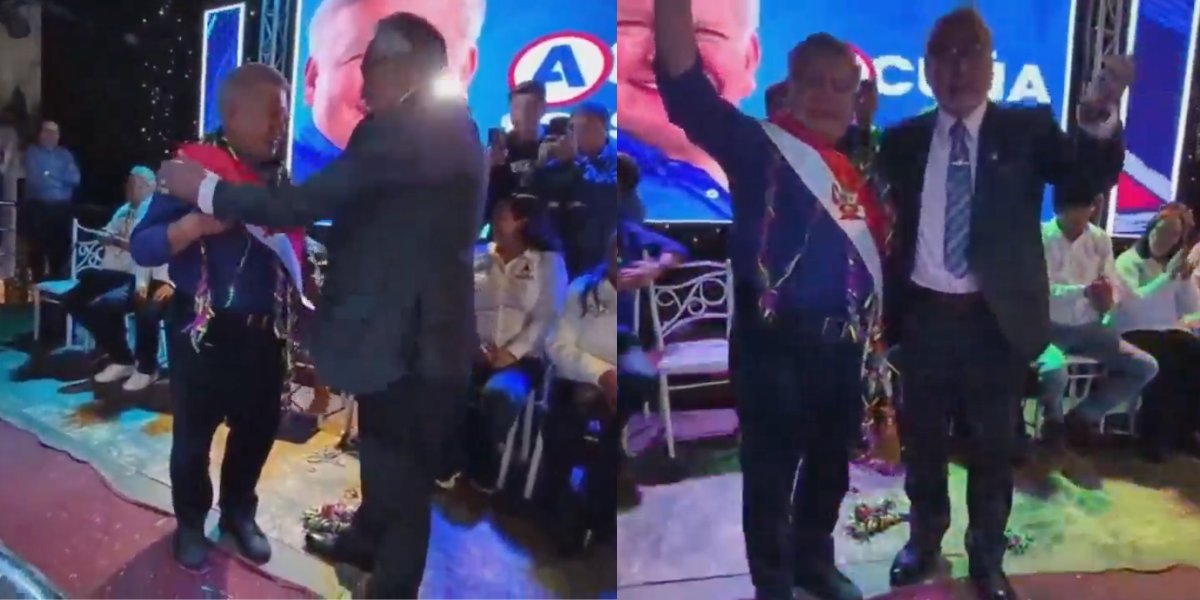 Eleazar Crucinta Ugarte, quien desempeña el cargo de rector de la Universidad Nacional de San Antonio Abad del Cusco (UNSAAC), colocó una banda presidencial simbólica al candidato Cesar Acuña Peralta, máximo líder y dueño del partido Alianza Para el Progreso (APP), durante una actividad proselitista de campaña electoral en Cusco.