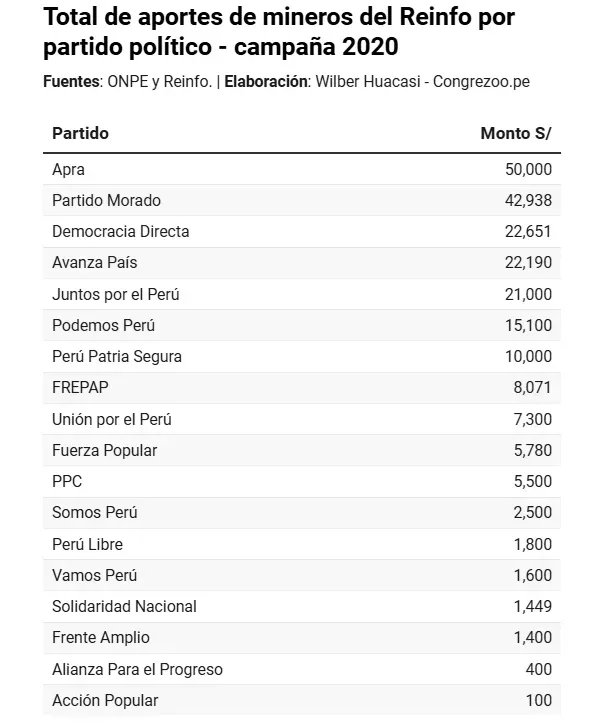 En la campaña del 2020, por cierto, hubo 103 aportes de los mineros del Reinfo para la campaña de los aspirantes al Congreso. Los apoyos, que en la mayoría de los casos fueron en dinero en efectivo, se dieron para un total de 39 candidatos de 18 organizaciones políticas.