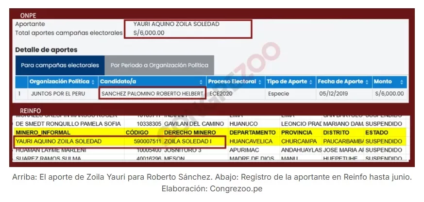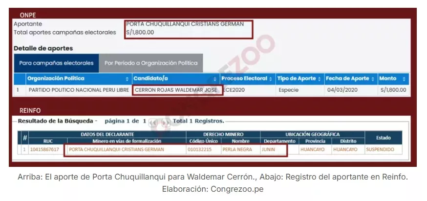 Los hechos se remontan a la campaña de las elecciones complementarias del 2020. En aquella oportunidad Waldemar Cerrón (Perú Libre) y Roberto Sánchez (Juntos por el Perú) postularon sin éxito para el Parlamento. Durante su campaña ambos recibieron aportes de mineros del Reinfo (Registro Integral de Formalización Minera).