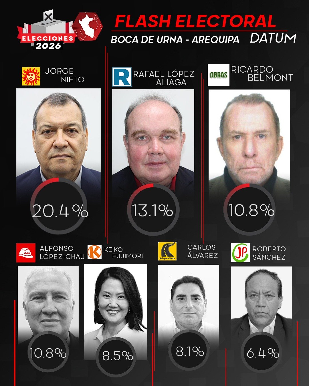 López-Chau y y Ricardo Belmont obtienen ambos el 10.8% en Arequipa, según el boca de urna de Datum. La encuestadora señala para ambos la misma calificación. Este empate refleja una fragmentación del voto en la región, donde ningún otro candidato logra acercarse a estos niveles de respaldo, al menos en esta primera medición a boca de urna.