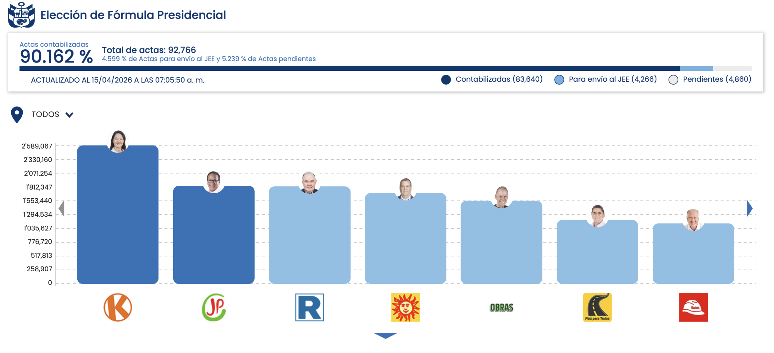 El total de actas contabilizadas por la ONPE hasta las 7:05 am de este 15 de abril es de 92,766. No incluye al 4.599 % de actas observadas para su envío al JEE y un 5.239 % de actas pendientes de conteo. Estas últimas son de distritos rurales y del extranjero.