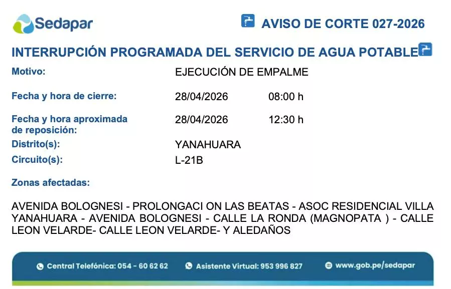 Asimismo, en sectores de Miraflores, Sachaca y Yanahuara, con los circuitos L-2, L-21B, L-21C, N-21B, N-21C, N-24, R-22, R-23, R-23A y R-37, el corte de agua será desde las 06:00 horas hasta las 23:30 horas del martes 28 de abril. Se verán afectados lugares como la Avenida Goyeneche en Miraflores, Pampa de Camarones en Sachaca y la Urbanización Piedra Santa en Yanahuara. Cabe resaltar que en Yanahuara también habrá un corte específico por ejecución de empalme en el circuito L-21B que afectará la Avenida Bolognesi, Calle León Velarde y alrededores desde las 08:00 horas hasta las 12:30 horas.