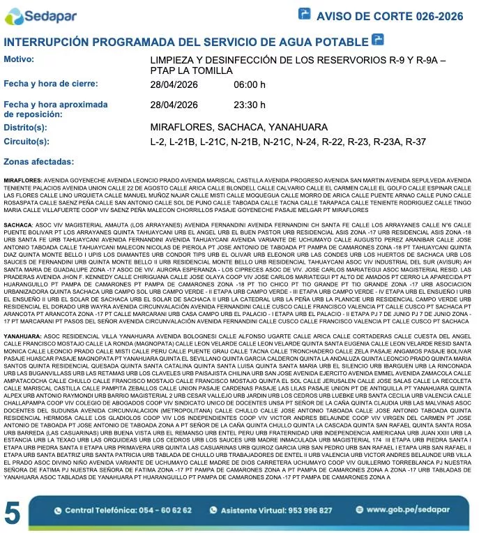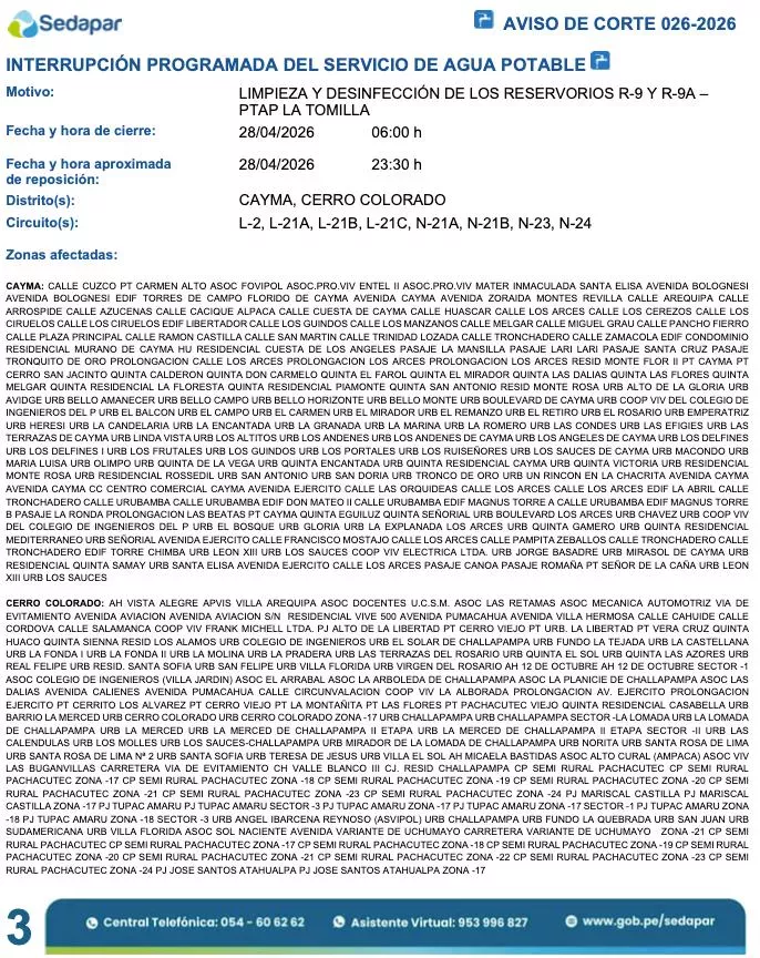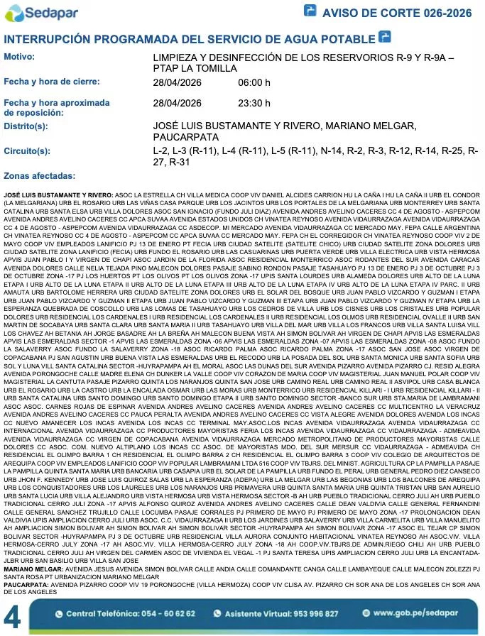 En gran parte de los distritos de José Luis Bustamante y Rivero, Mariano Melgar y Paucarpata, correspondientes a los circuitos L-2, L-3, L-4, L-5, N-14, R-2, R-3, R-12, R-14, R-25, R-27 y R-31, se restringirá el suministro hídrico por la limpieza de los reservorios R-9 y R-9A desde las 06:00 horas hasta las 23:30 horas del martes 28 de abril. Esta medida afectará zonas como la Urbanización Juan Pablo Vizcardo y Guzmán, Urbanización San José, Urbanización Villa Eléctrica, Urbanización Dolores, entre otras decenas de sectores detallados en el aviso 026-2026.