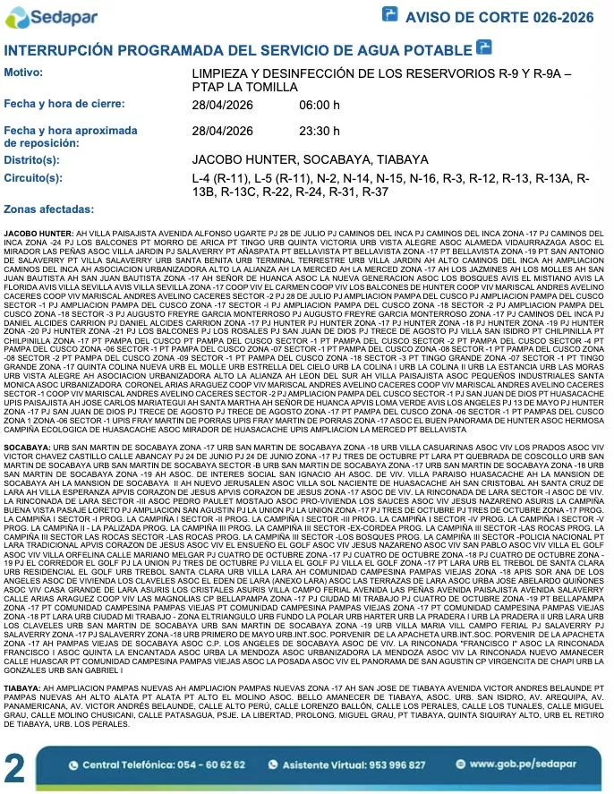 Para las localidades de Jacobo Hunter, Socabaya y Tiabaya, bajo los circuitos L-4, L-5, N-2, N-14, N-15, N-16, R-3, R-12, R-13, R-13A, R-13B, R-13C, R-22, R-24, R-31 y R-37, la interrupción por desinfección de reservorios ocurrirá desde las 06:00 horas hasta las 23:30 horas del martes 28 de abril. Entre las zonas afectadas figuran la Urbanización San Martín de Socabaya, Villa Paisajista, Pampas del Cusco, y diversos asentamientos humanos y urbanizaciones de estas jurisdicciones.
