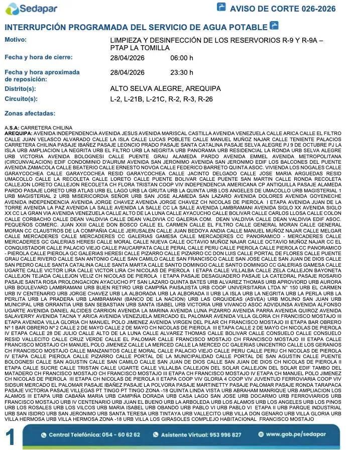 En los distritos de Alto Selva Alegre y Arequipa (Cercado), que integran los circuitos L-2, L-21B, L-21C, R-2, R-3 y R-26, se suspenderá el servicio desde las 06:00 horas hasta las 23:30 horas del martes 28 de abril por mantenimiento en la PTAP La Tomilla. Las zonas incluyen calles céntricas como Jerusalén, San Juan de Dios, Palacio Viejo, así como las urbanizaciones Selva Alegre, Residencial La Ronda y sectores de Alto Selva Alegre.