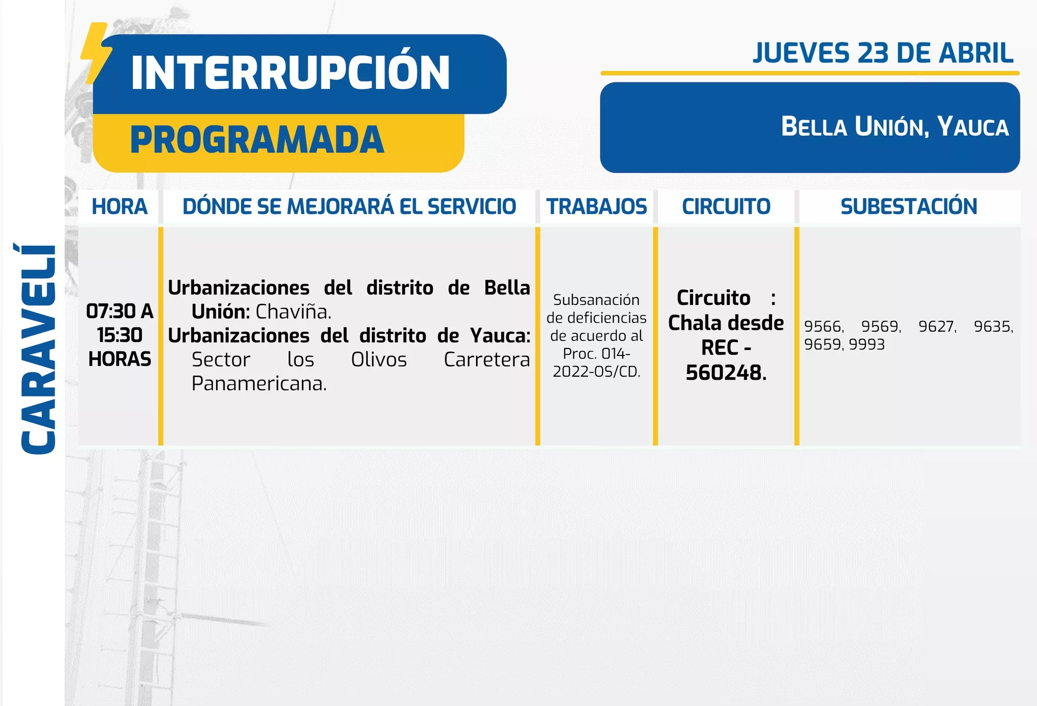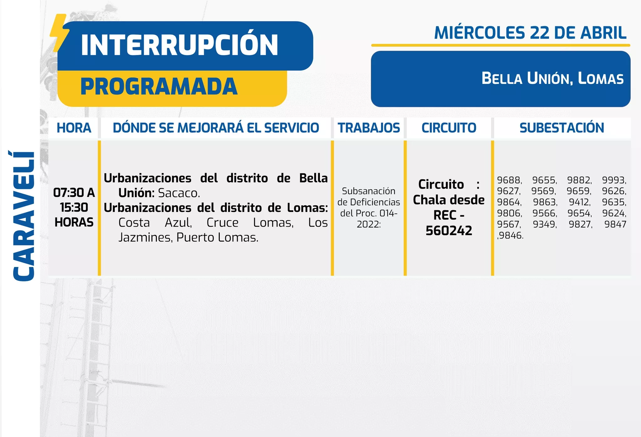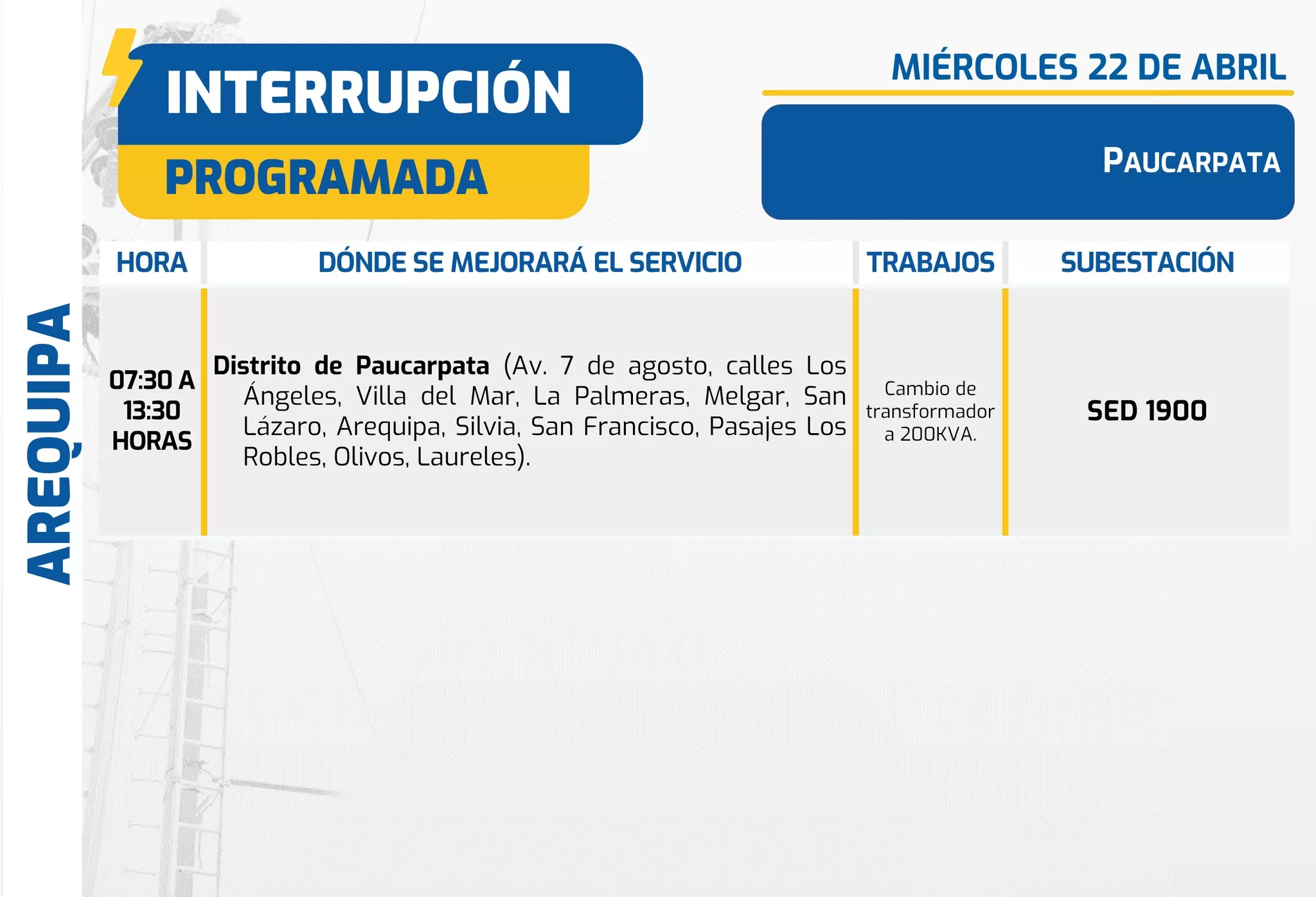 Algunas zonas del distrito de Paucarpata tienen cortes de luz programados a partir de las 07:30 hasta las 13:30 horas por cambio de transformador. En tanto, ciertos sectores de la localidad de La Joya quedarán sin el servicio eléctrico entre 08:00 y 15:00 horas por mantenimiento de redes y podado de árboles. Asimismo, partes de la jurisdicción de Mollendo en la provincia de Islay estarán con restricción del suministro entre 07:00 y 15:00 horas. Por otro lado, áreas en las comunas de Cayarani, Chilcaymarca y Orcopampa verán su servicio interrumpido de 07:00 a 15:00 horas. Finalmente, algunos sectores en los distritos de Bella Unión y Lomas, en la provincia de Caravelí, no contarán con el fluido eléctrico desde las 07:30 hasta las 15:30 horas.