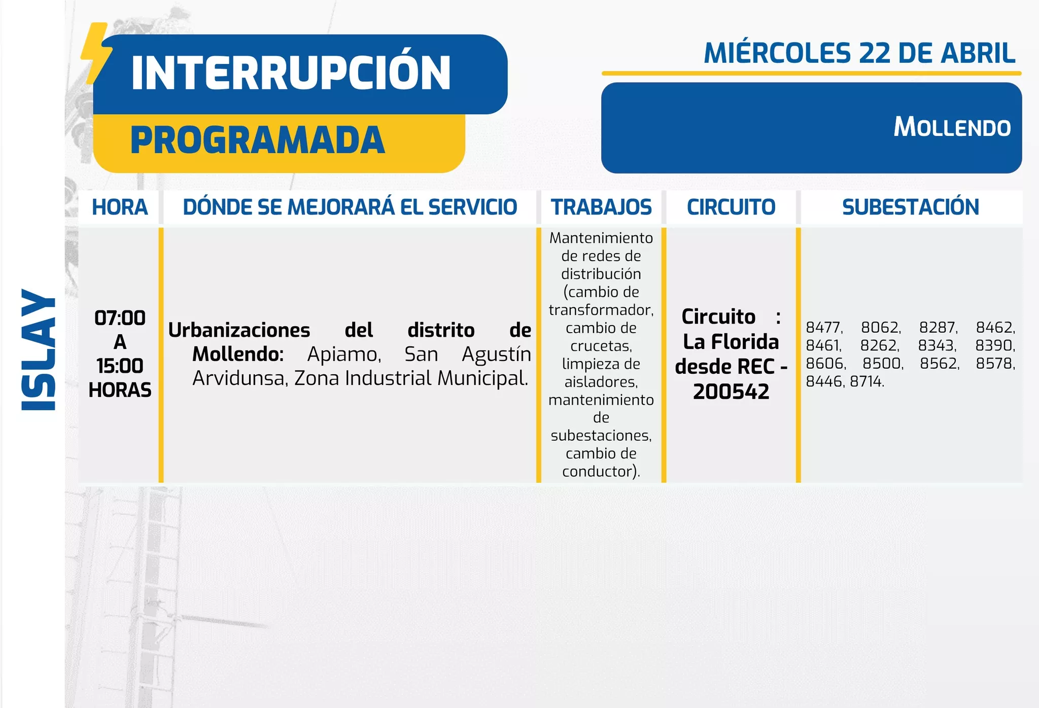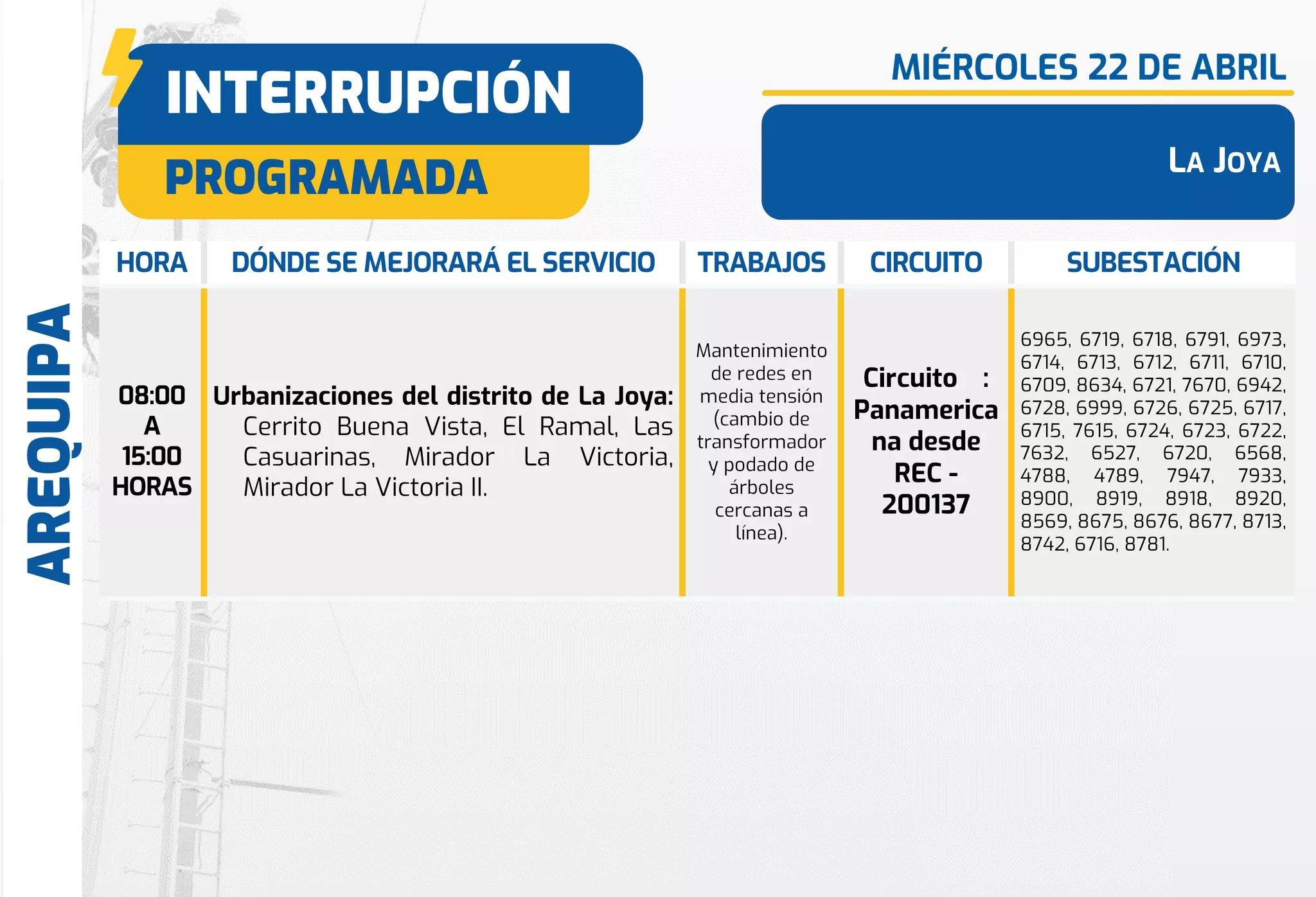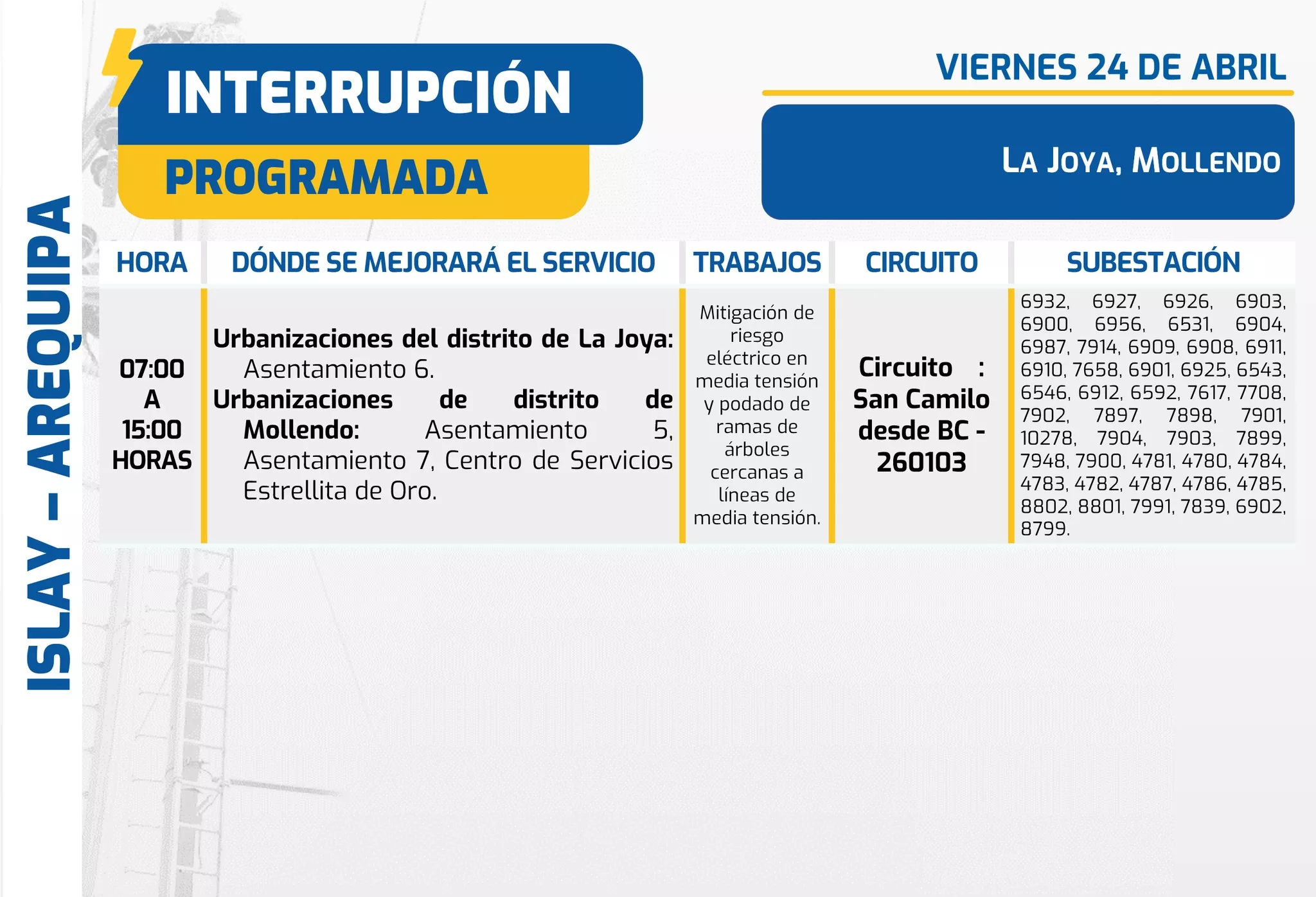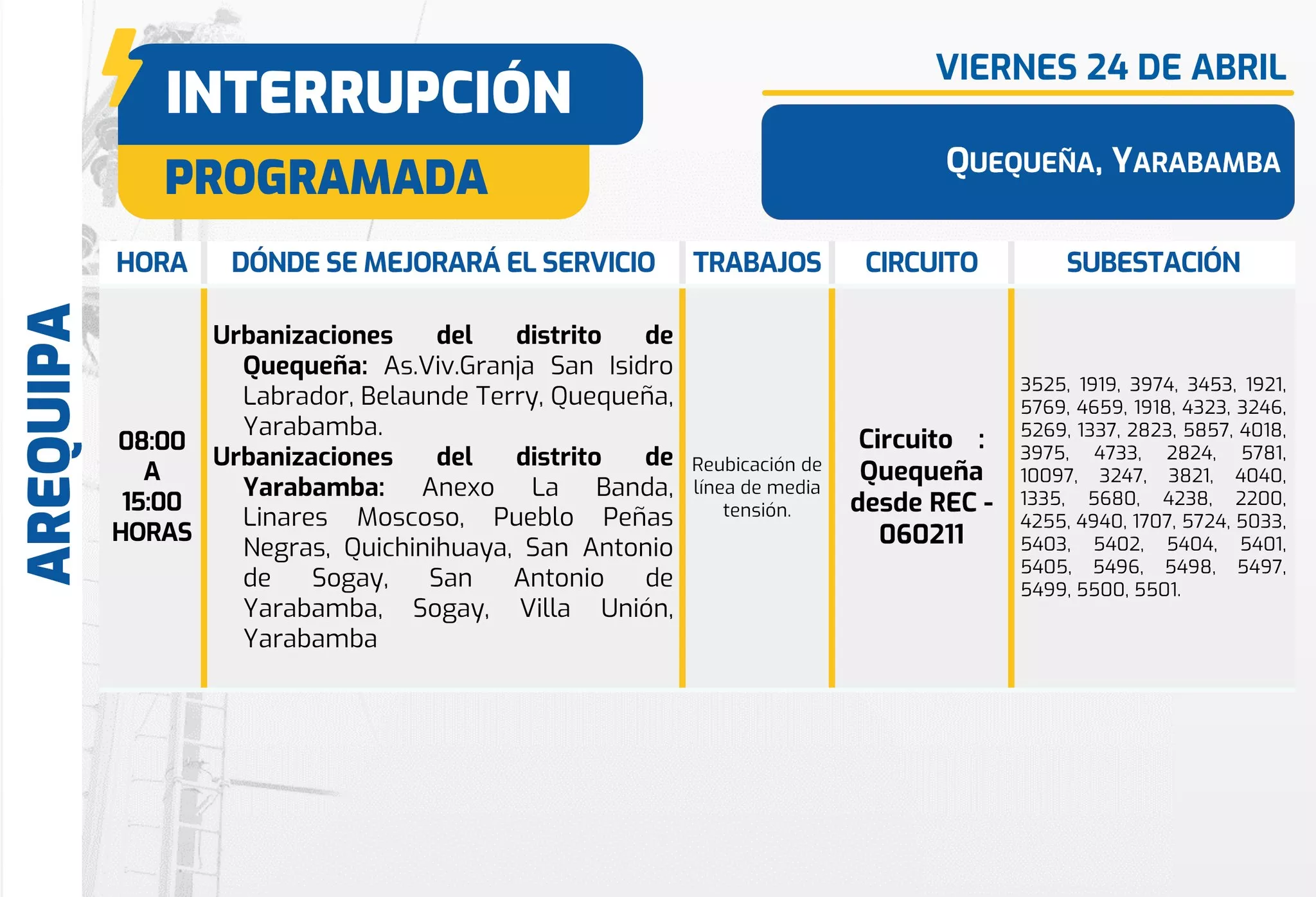 Algunas zonas de los distritos de Quequeña y Yarabamba tienen cortes de luz programados a partir de las 08:00 hasta las 15:00 horas debido a la reubicación de líneas de media tensión. Asimismo, ciertos sectores en las jurisdicciones de La Joya y Mollendo no contarán con el suministro eléctrico entre las 07:00 y 15:00 horas por trabajos de mitigación de riesgo y poda de árboles.