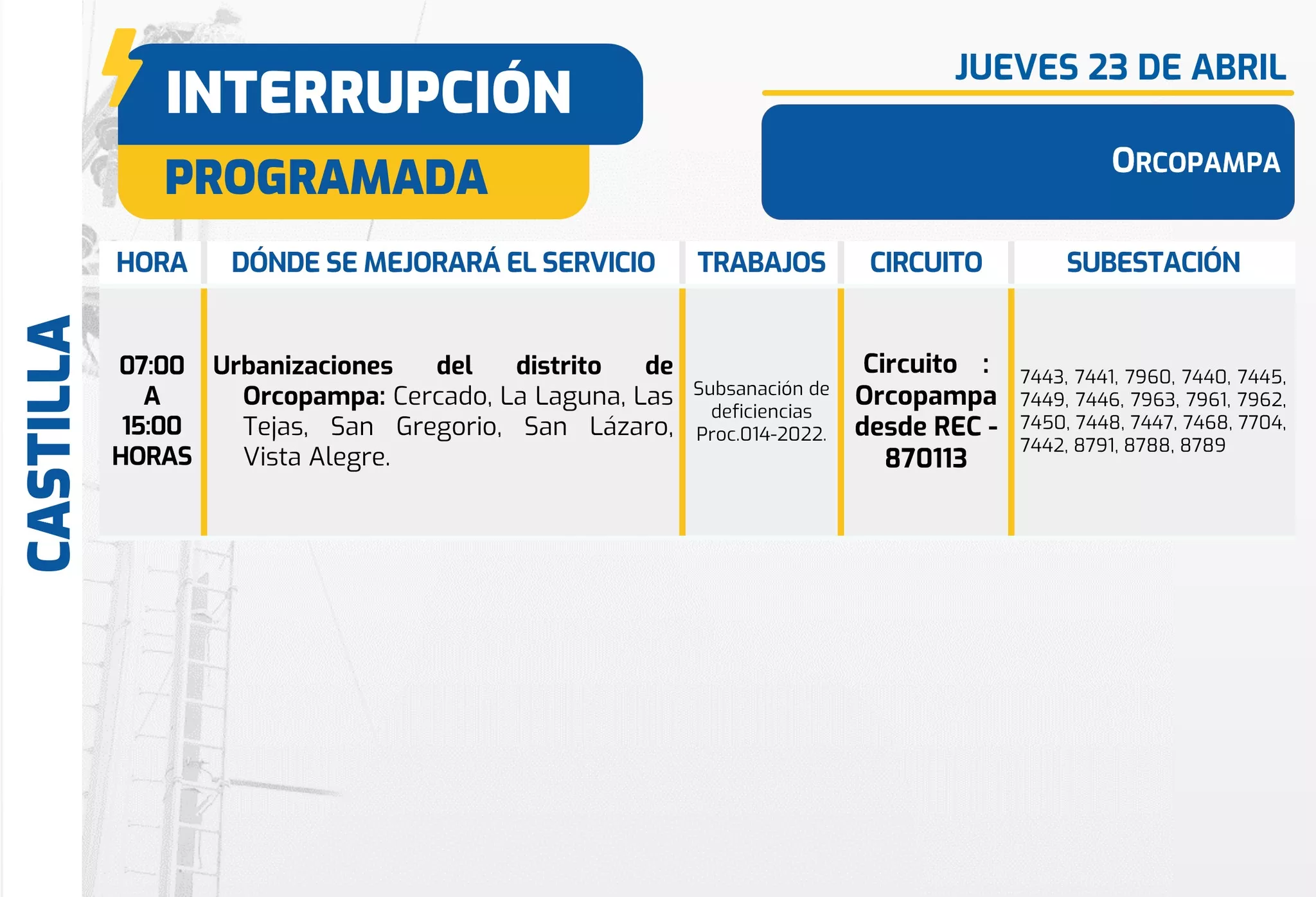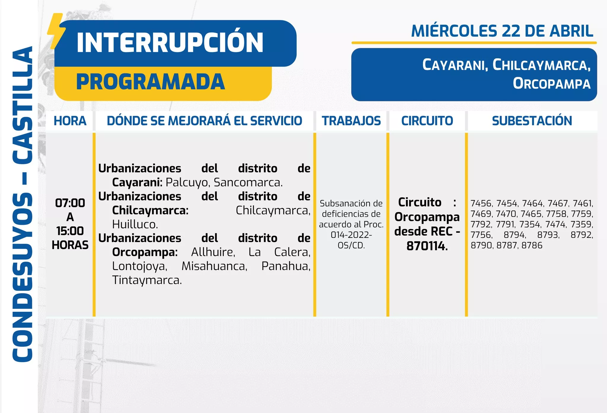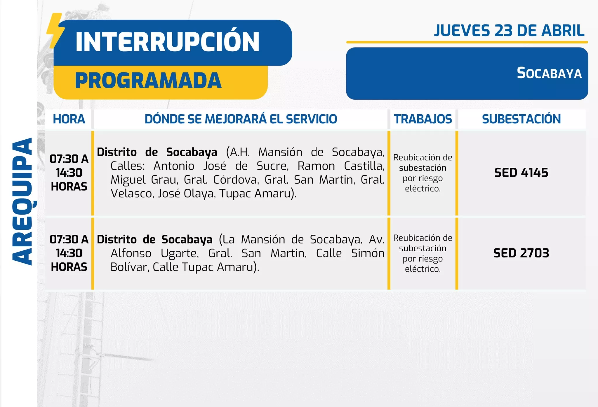 Diferentes zonas del distrito de Socabaya presentan cortes de luz programados en dos sectores desde las 07:30 hasta las 14:30 horas por reubicación de subestación. Por su parte, la zona urbana de Orcopampa tendrá la interrupción del servicio entre las 07:00 y 15:00 horas por subsanación de deficiencias. Además, sectores de los distritos de Bella Unión y Yauca, en la provincia de Caravelí, se verán afectados por la restricción eléctrica en el horario de 07:30 a 15:30 horas.