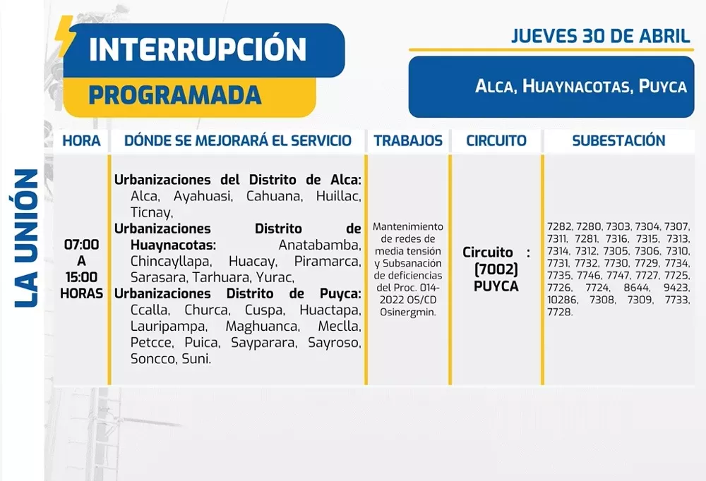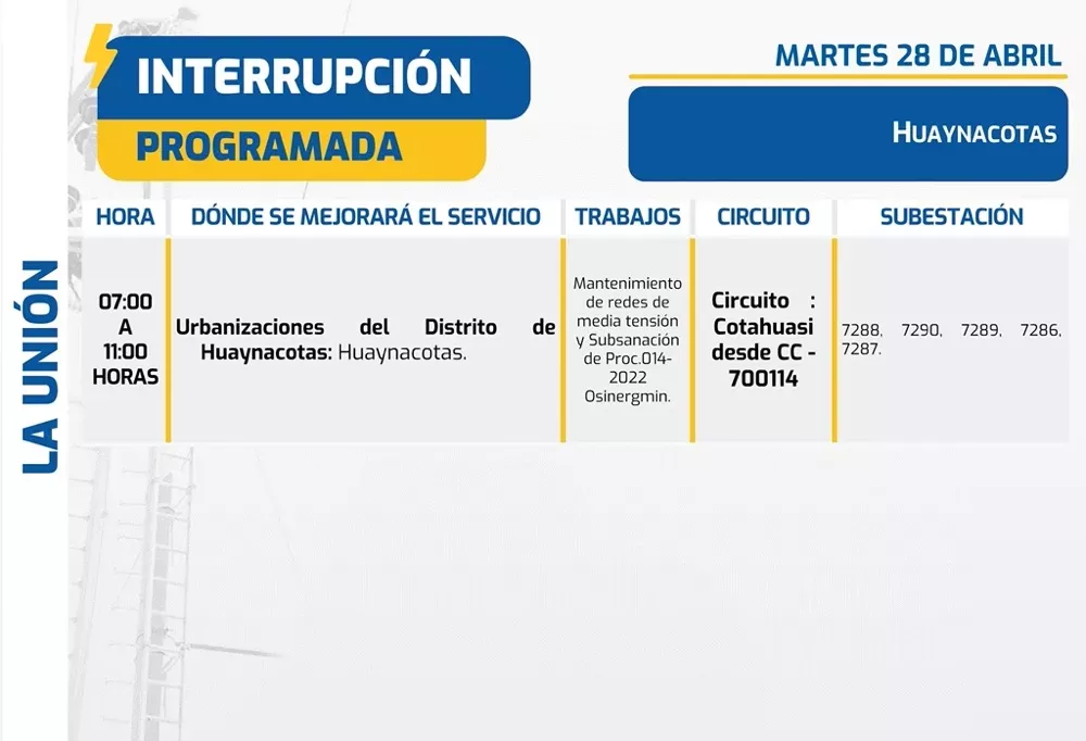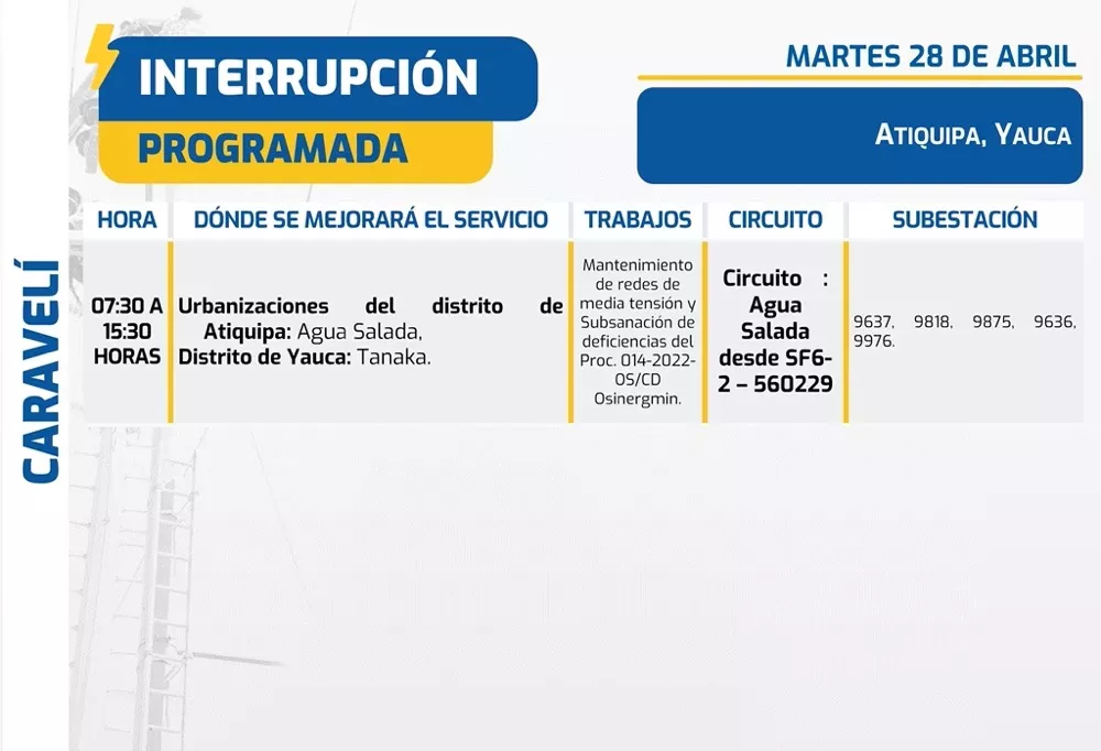 Algunas zonas del distrito de Huaynacotas en la provincia de La Unión tienen cortes de luz programados a partir de las 07:00 hasta las 11:00 horas. Asimismo, sectores de los distritos de Atiquipa (Agua Salada) y Yauca (Tanaka) en la provincia de Caravelí quedarán sin el servicio eléctrico entre 07:30 y 15:30 horas. En tanto, áreas de la jurisdicción de La Joya (Héroes Anónimos, La Florida, Leche Gloria) en la provincia de Arequipa verán su servicio interrumpido desde las 08:00 hasta las 15:00 horas.