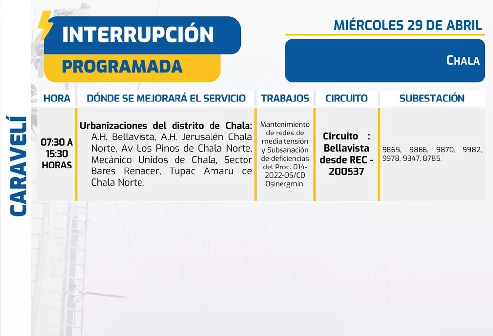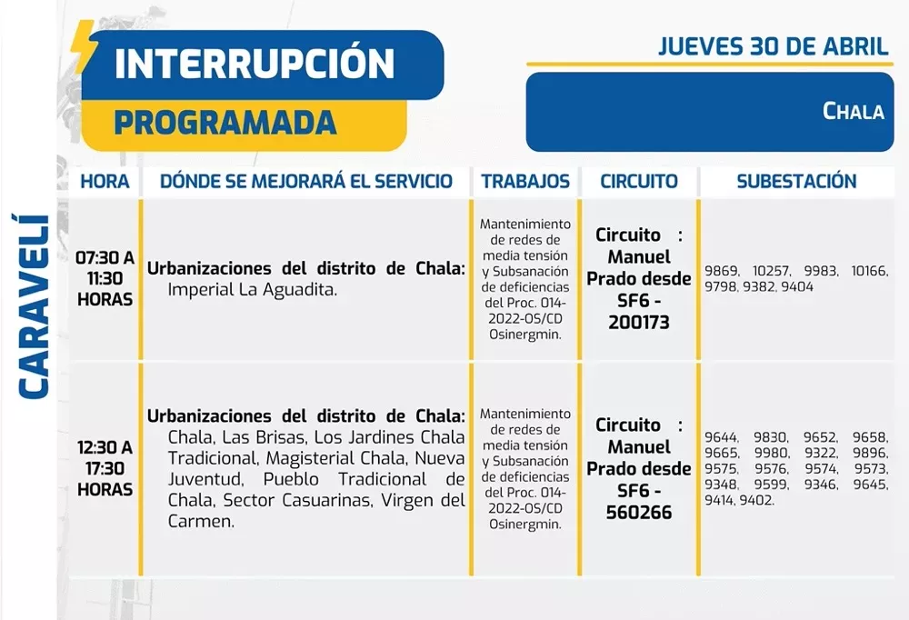 Algunas zonas del distrito de Chala en la provincia de Caravelí presentan interrupciones en dos horarios: en la urbanización Imperial La Aguadita de 07:30 a 11:30 horas, y en sectores como Chala Tradicional, Las Brisas, Los Jardines, Magisterial, Nueva Juventud, Pueblo Tradicional, Sector Casuarinas y Virgen del Carmen de 12:30 a 17:30 horas. Finalmente, diversas localidades de los distritos de Alca, Huaynacotas y Puyca en la provincia de La Unión tienen cortes de luz programados a partir de las 07:00 hasta las 15:00 horas.