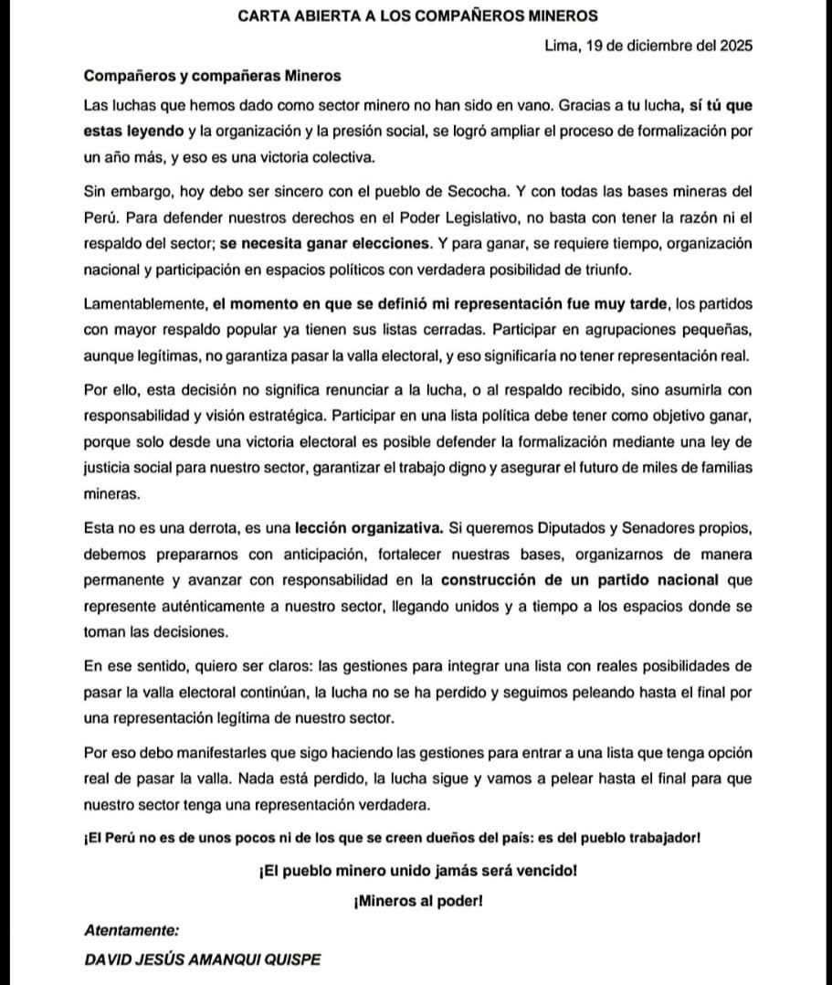 El problema era conseguir un partido que fuese su vientre de alquiler para llegar al Congreso. Amanqui, en una carta pública a sus compañeros, sostuvo que era muy difícil que una organización política lo albergue. “Sigo haciendo las gestiones para entrar a una lista que tenga opción real de pasar la valla (electoral). Nada está perdido, la lucha sigue y vamos a pelear hasta el final para que nuestro sector tenga una representación verdadera”, les comunicó en diciembre del 2025.