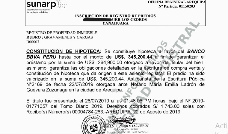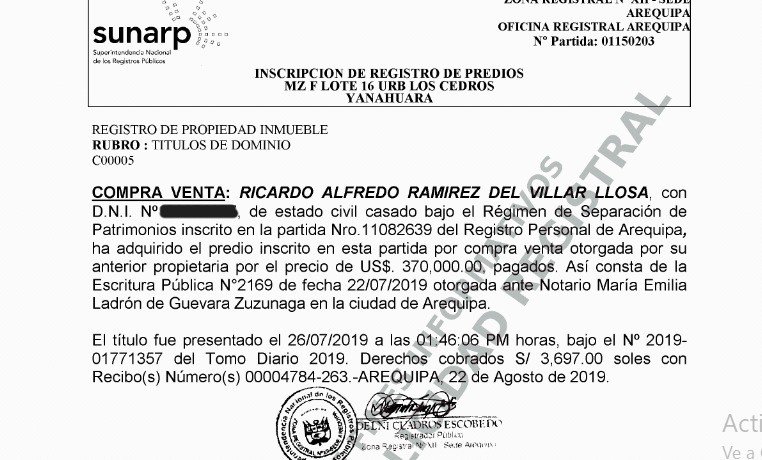 Mientras que varios de los predios ubicados en la ciudad de Arequipa superan el millón de soles. Es el caso de su vivienda de la Urb. Los Cedros del distrito de Yanahuara por la que pagó US$ 370 000 en julio del 2019. La propiedad fue hipotecada en la misma fecha que la compró por un préstamo de US$ 284 900 otorgado por la BBVA.