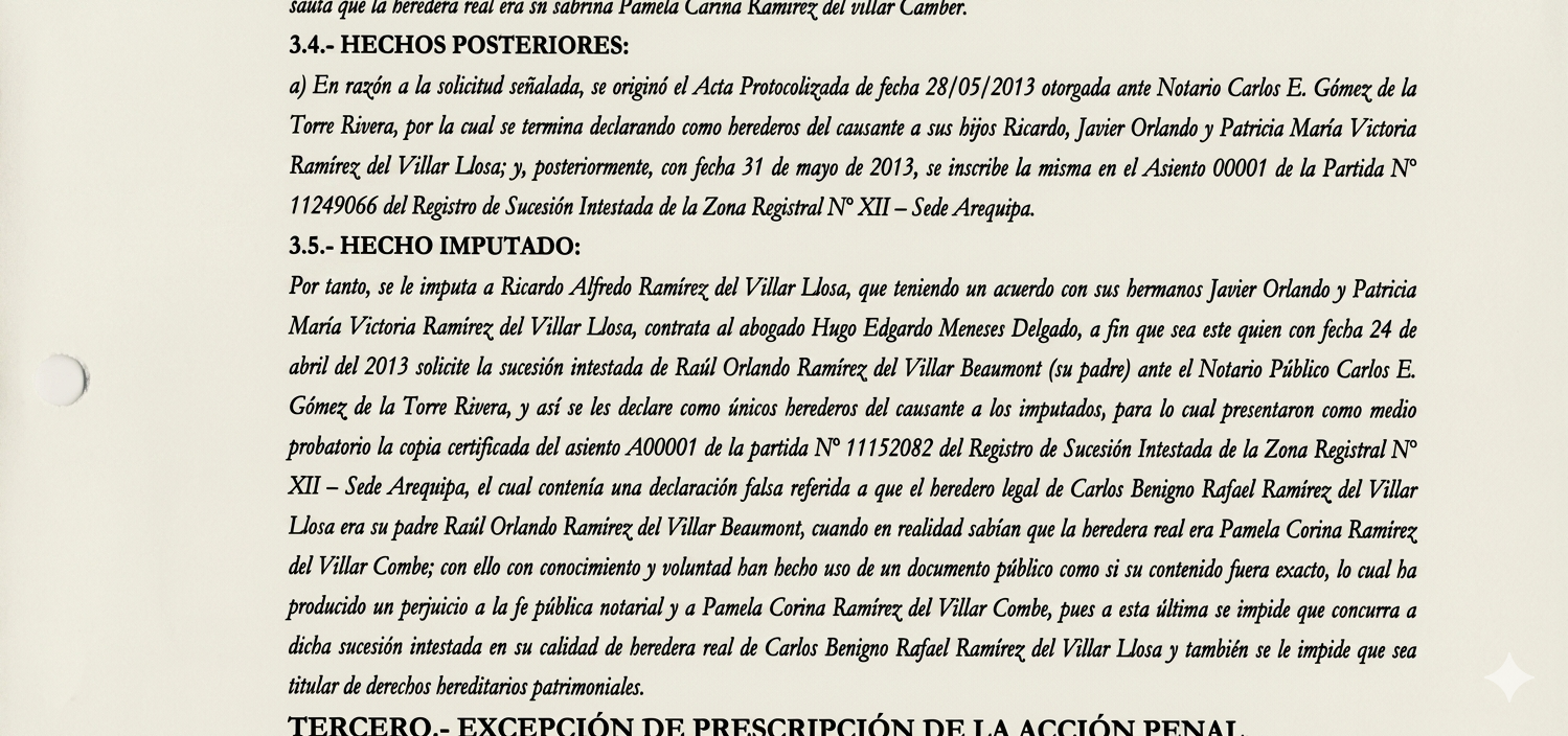 Ante la muerte del patriarca en 2013, los derechos fueron finalmente distribuidos entre los hermanos vivos, y el político obtuvo una parte. Por estas acciones, Ramírez del Villar fue sentenciado a tres años de cárcel suspendida por ser autor mediato de falsedad ideológica y al pago de S/ 25 000 en favor de su sobrina, en 2023. Ante su petición de prescripción, la sentencia fue anulada en cuanto a la sanción penal, solo confirmando la disposición de la reparación civil.  Ahora el caso se encuentra en casación, según consignó el propio Ramírez del Villar, con lo que busca no pagar la reparación.
