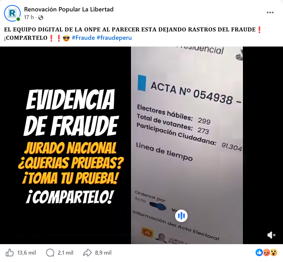 Un video difundido en Facebook el 15 de abril —y que ha sido compartido por más de 8.900 usuarios, entre ellos la página de Renovación Popular La Libertad— señala una supuesta irregularidad en la digitación del acta de sufragio presidencial de la mesa 054938, ubicada en el local de votación de la I.E. Alfonso Ugarte de San Juan de Miraflores.