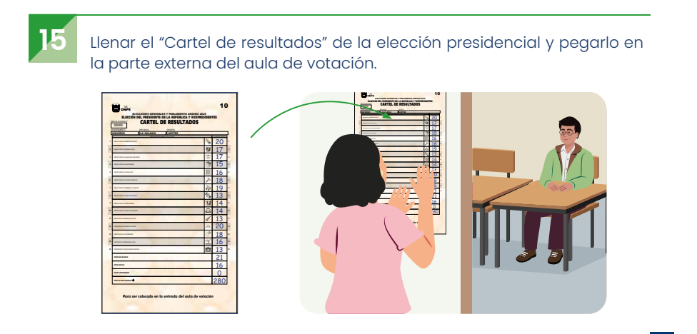 Mientras tanto, el cartel de resultados es un documento al que se traslada, como último paso, la información registrada en el acta electoral, y no lleva firma de los miembros de mesa. Este no es un documento que se envíe a los digitadores, sino que se pega fuera del aula en la que se ubicó la mesa de sufragio. Cualquier ciudadano puede verla.