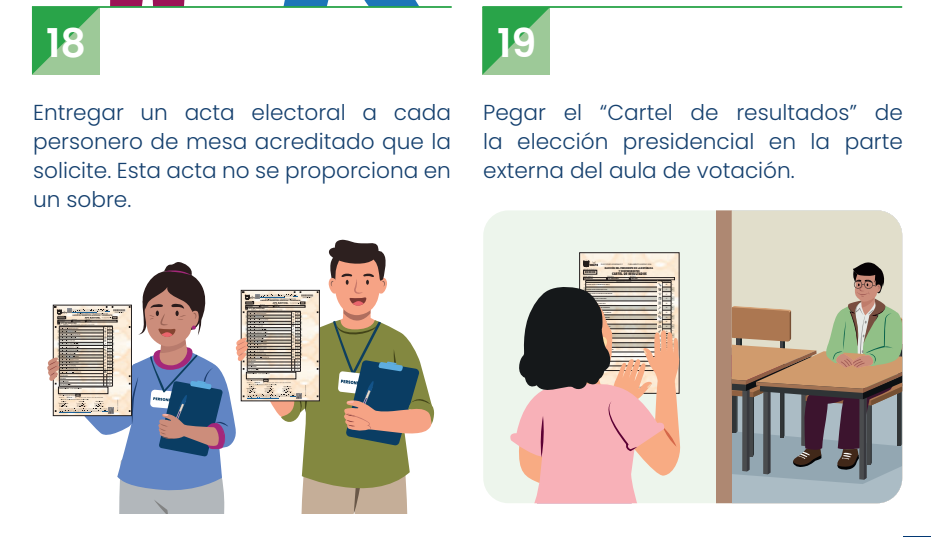 De acuerdo al manual de miembros de mesas, tanto el acta electoral como el cartel de resultados son dos documentos electorales usados para trasladar los resultados del escrutinio.La diferencia es que el acta electoral lleva la firma de los miembros de mesa, se sella en presencia de los personeros y es el documento que se entrega a los coordinadores de mesa de la ONPE, y también se entrega una copia, a petición, a los personeros acreditados de los partidos políticos.