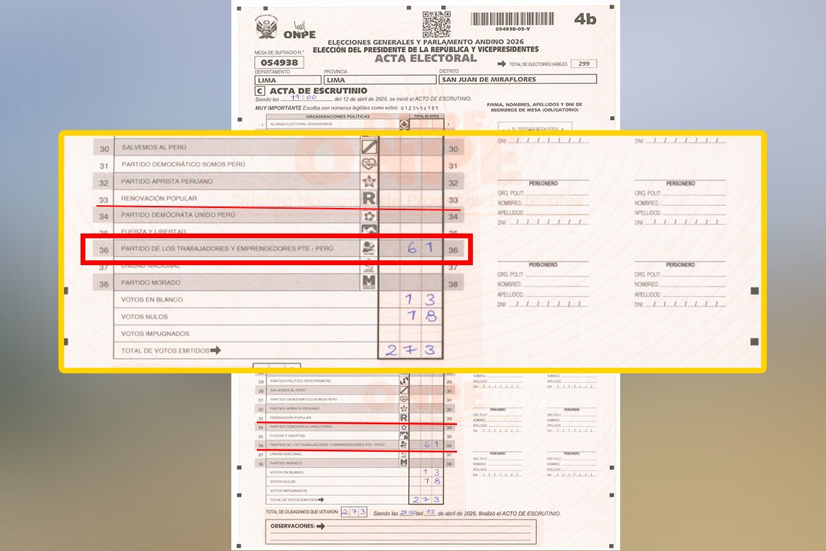 Es falso que en la mesa 054938, Renovación Popular tenga 61 votos, como dice viral