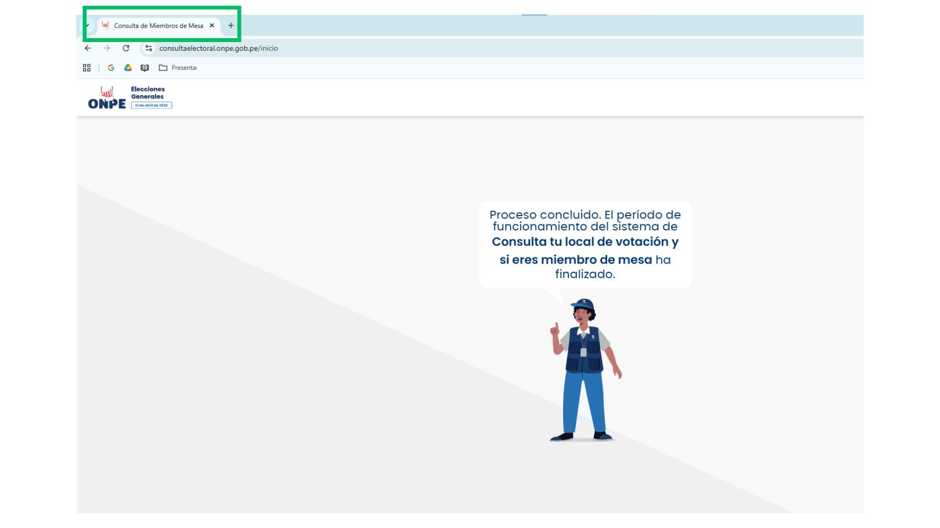 La imagen corresponde a una plataforma específica de la ONPE habilitada antes de las Elecciones, cuyo objetivo es informar a los ciudadanos dónde votar y si fueron designados como miembros de mesa. Como su propio mensaje de la imagen indica, este servicio tiene un periodo de funcionamiento limitado y deja de estar disponible una vez concluida la jornada electoral, por lo que su desactivación es un procedimiento regular y esperado.