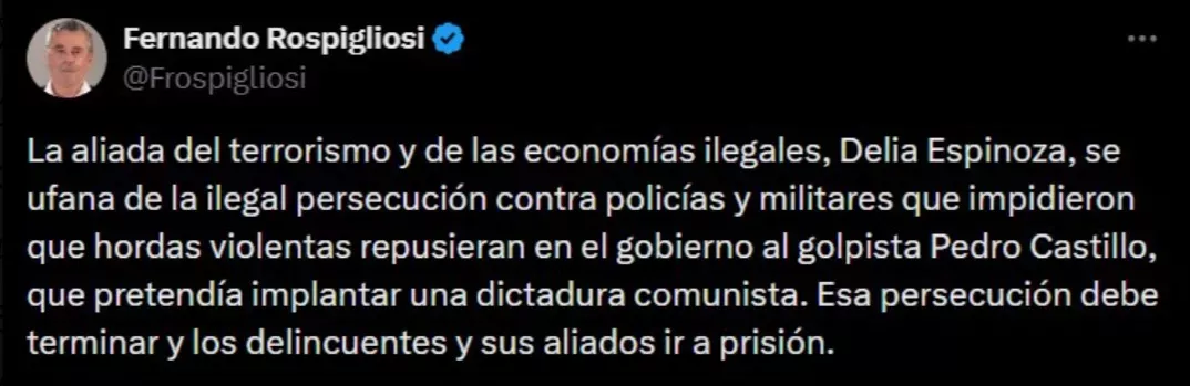 “La aliada del terrorismo y de las economías ilegales, Delia Espinoza, se ufana de la ilegal persecución contra policías y militares que impidieron que hordas violentas repusieran en el gobierno al golpista Pedro Castillo, que pretendía implantar una dictadura comunista. Esa persecución debe terminar y los delincuentes y sus aliados ir a prisión”, escribió.