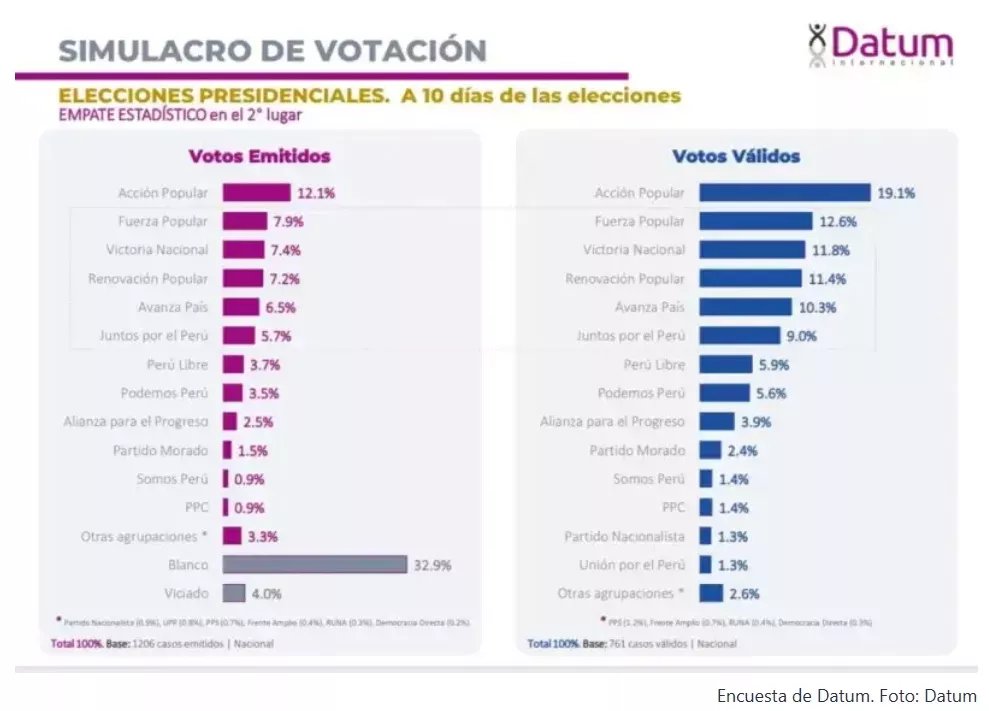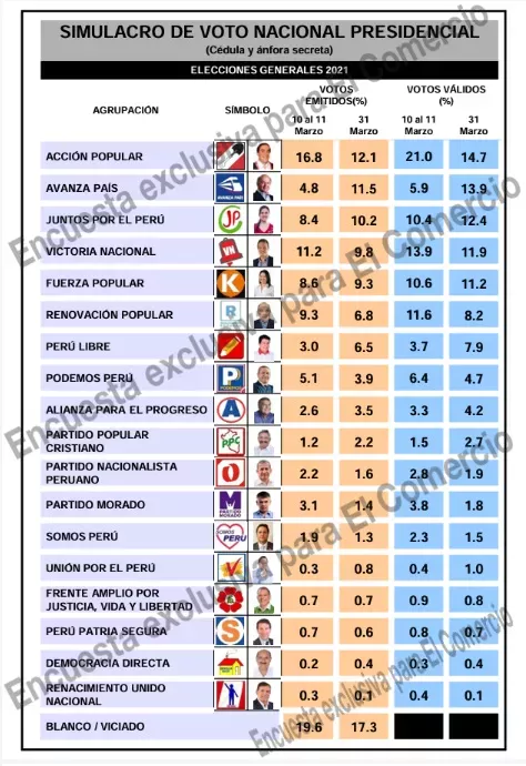 El simulacro de voto de Datum Internacional se realizó del 27 al 29 de marzo entre 1,206 personas. El estudio tuvo un margen de error de +/- 2.8 %, con un nivel de confianza del 95 % y una representatividad del 100 %. Para esta encuesta se utilizó un simulacro de voto presencial.