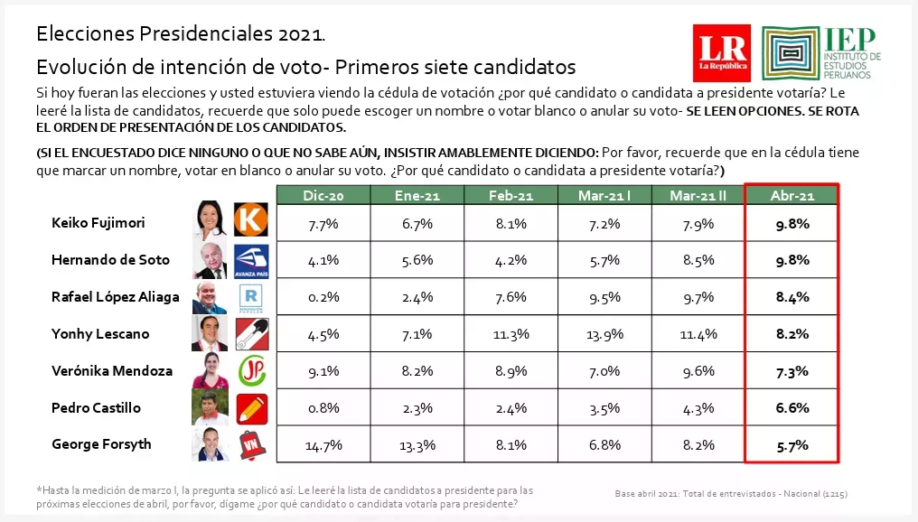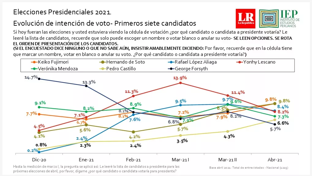 Pero a una semana de las elecciones el 11 de abril del 2021, las encuestas de Ipsos Perú e IEP (Instituto de Estudios Peruanos), los resultados ponían como favoritos a Yonhy Lescano seguido de Hernando de Soto y a Keiko Fujimori también seguida por de Soto. Pedro Castillo o no estaba entre seis primeros puestos u ocupaba el sexto. Veamos los porcentajes de entonces: