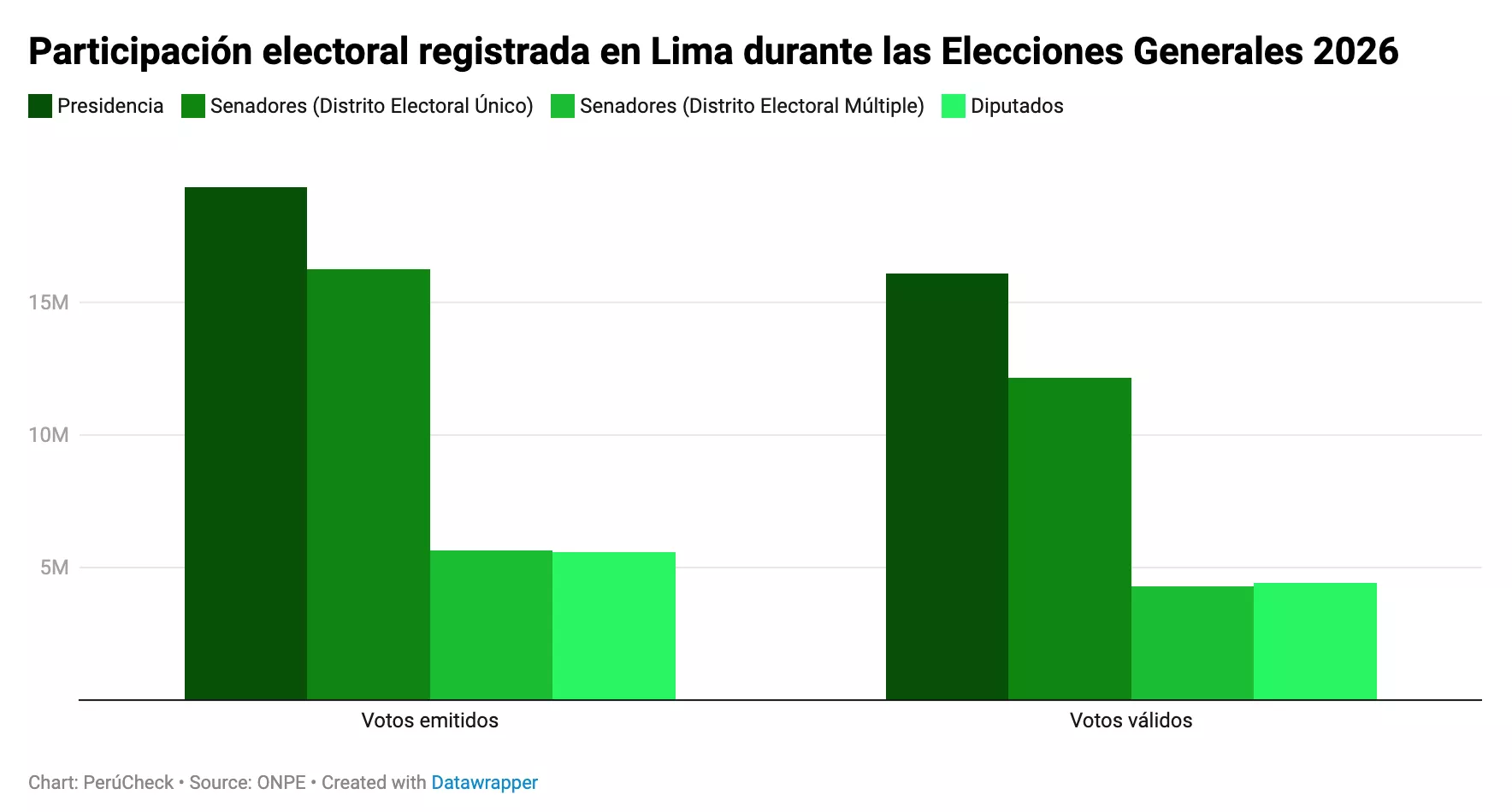 Sin embargo, los resultados oficiales de la Oficina Nacional de Procesos Electorales (ONPE) muestran que sí hubo una participación masiva de electores en Lima durante las Elecciones Generales 2026. Sí hubo, sin embargo, una crisis de sufragio en distritos del sur de Lima, donde las mesas de votación no llegaron a abrirse el domingo 12 de abril, por lo que las elecciones tuvieron que extenderse, en estos distritos, al día siguiente. En otros lugares del país, mesas de votación se abrieron con horas de retraso.