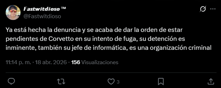 El 18 de abril, la Policía, a través de la Dirincri, la dirección de investigación criminal, negó que haya llegado a ellos alguna orden de captura de Corvetto. Sin embargo, en redes sociales la noticia falsa ya se había extendido.