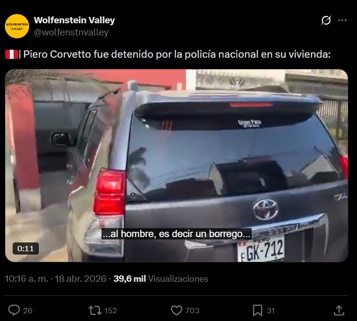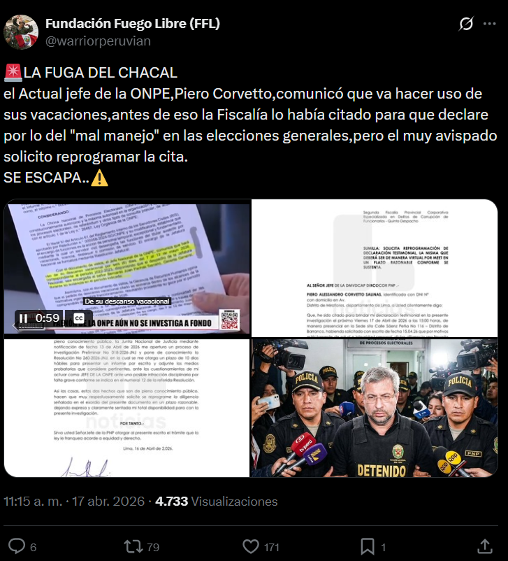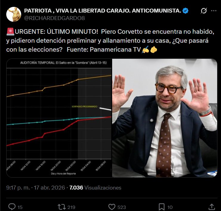 Corvetto no ha sido detenido. Sin embargo, el Ministerio Público ha oficializado un pedido de detención preliminar contra él por las irregularidades documentadas durante la primera vuelta electoral del 12 de abril. La decisión final la tomará un juez.