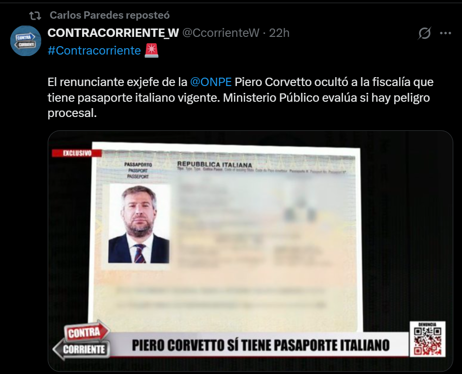 Por último, el programa Contracorriente abonó a la narrativa de fuga con información errónea sobre el proceso que acarrea Corvetto ante Fiscalía. Para dar fe de que no intenta escaparse, Corvetto ofreció entregar su pasaporte al ente. El 21 de abril, el programa señaló que el exfuncionario no informó que contaba también con un pasaporte italiano. Además, se dijo que no lo presentó. Al día siguiente y temprano, el Fiscal de la Nación aclaró que el exfuncionario sí lo había hecho.