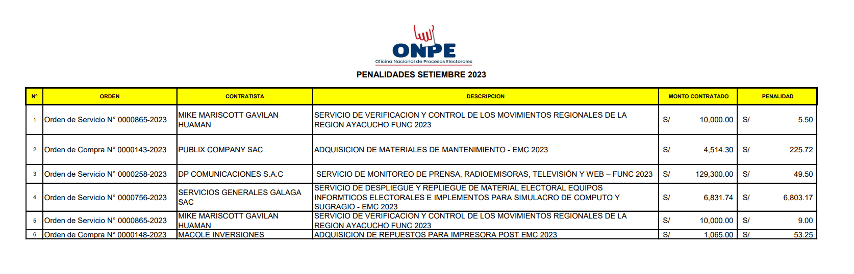 Por último, la tercera penalidad se registra en setiembre de 2023. Servicios Generales Galaga, por una Orden de Servicio N° 0000756-2023, estuvo a cargo del despliegue y repliegue de material electoral, equipos informáticos electorales e implementos para simulacro de cómputo y sufragio de las elecciones municipales complementarias de 2023. El monto del contrato ascendía a S/6.68 millones. La penalidad fue de S/6,803.17.