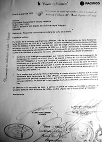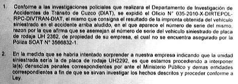 Para desazón de Inocencio, lo único que encontró en la abandonada agencia de transporte fue una notificación de la aseguradora Pacífico que desampara totalmente a las víctimas de la ilegal empresa. Sin póliza Y es que el pasado 5 de enero Guapo Lindo, solicitó a la aseguradora que activara la póliza Soat 3566832-1 de la unidad vehicular UH2292, la cual afirmaba había sido la que se siniestró el pasado 24 de diciembre. Sin embargo, Pacífico contestó el pasado 8 de enero que la póliza no podía pagarse porque según la investigación policial del departamento de Investigaciones de Accidente de Tránsito de Cusco (DIAT), se determinó que la verdadera placa del bus accidentado era la UH2362 que no tenía Soat vigente desde el 23 de mayo de 2009. En la misiva enviada por Pacífico, aseguran que Guapo Lindo intentó sorprenderlos al tratar de hacer pasar la placa UH2292 como la del bus siniestrado. Ante esta actitud Pacífico comunicaba, además, que interpondría denuncias penales ante el Ministerio Público y otras entidades correspondientes.
