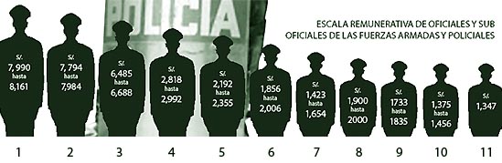 Un aumento salarial para los militares y efectivos del orden todavía se ve verde, como su uniforme. Mientras madura la idea de una huelga policial, el Ejecutivo habla de una asignación especial que alivie el descontento de los efectivos en servicio y en retiro, pero no hay una fecha ni visos de que esta se haga efectiva. La salida de la asignación postulada por el presidente Alan García no ha caído bien. Principalmente entre los subalternos que se quejan de la gran diferencia que existe entre lo que ellos perciben y lo que recibe un oficial, y prefieren un aumento directo en sus haberes. Brechas El sueldo que percibe el más alto rango en las fuerzas armadas y policiales (Ver Tabla) fluctúa entre los 7 mil 990 a 8 mil 161 soles. Son cerca de seis mil soles de diferencia si se comparan con los casi 2 mil soles que gana el sub alterno de mayor rango en las Fuerzas Armadas o PNP (Policía Nacional del Perú). La brecha se hace mucho más grande en los niveles más bajos del escalafón. Por ejemplo un suboficial de tercera, que es el grado que obtiene un egresado de la escuela de suboficiales, percibe mil 347 soles. Percy Cáceres Gonzales, presidente de la Asociación de Policías Retirados, explica que a diferencia de los oficiales, los suboficiales no solo ganan menos sino que además no tienen acceso a las gollerías que sí tienen los altos mandos. Cáceres menciona, por ejemplo, que los generales reciben una bonificación para el pago de mayordomo y chofer, además es casi una práctica la entrega de un automóvil a los oficiales que pasan a situación de retiro. Combustible de protesta Desde el primero de marzo de 2001, el Decreto Supremo 037-2001-EF autorizó la entrega de dinero extra en efectivo al personal policial y de las Fuerzas Armadas. El dinero debía servir para la compra de combustible para el vehículo del Estado asignado al personal o para cubrir las comisiones de su servicio. La cantidad asignada dependía del rango, a mayor grado mayor el bono. En la práctica, la asignación tenía libre disponibilidad y no estaba sujeta a reintegro. En virtud a ese Decreto Supremo, un general recibe por gasolina 4 mil 56 soles. Sumado a los cerca de 8 mil de su sueldo son 12 mil soles los que reciben en ese rango. Al grado inmediatamente inferior (Coronel) le corresponde 3 mil 642 soles. Pero, dentro de los oficiales también hay diferencias. Un comandante recibe mil 80 soles; un mayor, 660 soles; y un capitán, 326 soles.