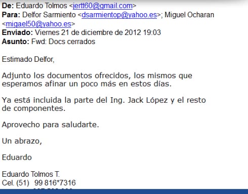 En este otro mail, Eduardo Tolmos, envía la versión final a todos los involucrados y participa también en la conversación su jefe, Antonio García del Villar, Director General de Clothos, quien viene a Lima para cerrar el trato con JMG.