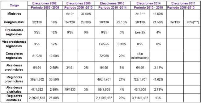 El cuadro que a continuación presentamos nos muestra la participación femenina en el total de los procesos electorales del siglo XXI, permitiéndonos una mirada de conjunto tanto a nivel congresal como de los gobiernos regionales y locales.
