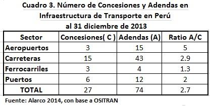 La práctica ha continuado hasta nuestros días. Dice Germán Alarco en un reciente informe, que “el número de contratos de Asociaciones Público Privadas (que también tienen contratos-ley) del sector transporte del gobierno del Perú es 27 al 31 de diciembre del 2013 y el número de modificaciones contractuales o adendas es de 74. El subsector de aeropuertos es el que tiene el mayor número de cambios, seguido por el subsector de ferrocarriles y carreteras” (3).