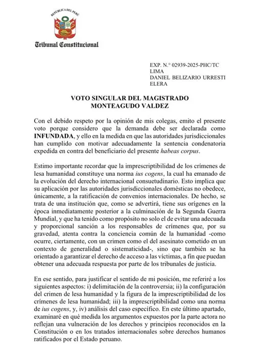 En su voto singular, el magistrado Monteagudo consideró que la demanda debía declararse infundada y advirtió que los crímenes de lesa humanidad son imprescriptibles según el derecho internacional.