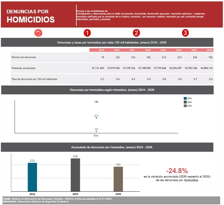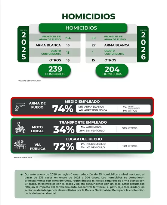 Así, y según lo registra el CENOPPOL-PNP, a nivel nacional en el Perú, en enero del 2026 se han registrado 204 homicidios, cifra menor a los 239 homicidios registrados en enero del 2025. “Sin embargo, el SIDPOL-PNP denota registros diferentes indicando que en enero del 2026 se han registrado 185 homicidios, inferior a los 246 homicidios registrados en enero del 2025”, refiere.