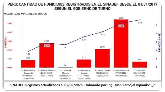 De acuerdo con el analista de datos, Juan Carbajal, “el Gobierno actual de José Jerí (tras casi 4 meses) sigue siendo el de mayor promedio diario de homicidios que cualquier gobierno anterior”. Según datos oficiales de esta gestión por medio del SINADEF, y de proseguir la tendencia actual hasta el término de su mandato podrían ser mayores. Sin embargo, el perito hace notar que ahora la Policía difunde dos registros de homicidios totalmente diferentes.